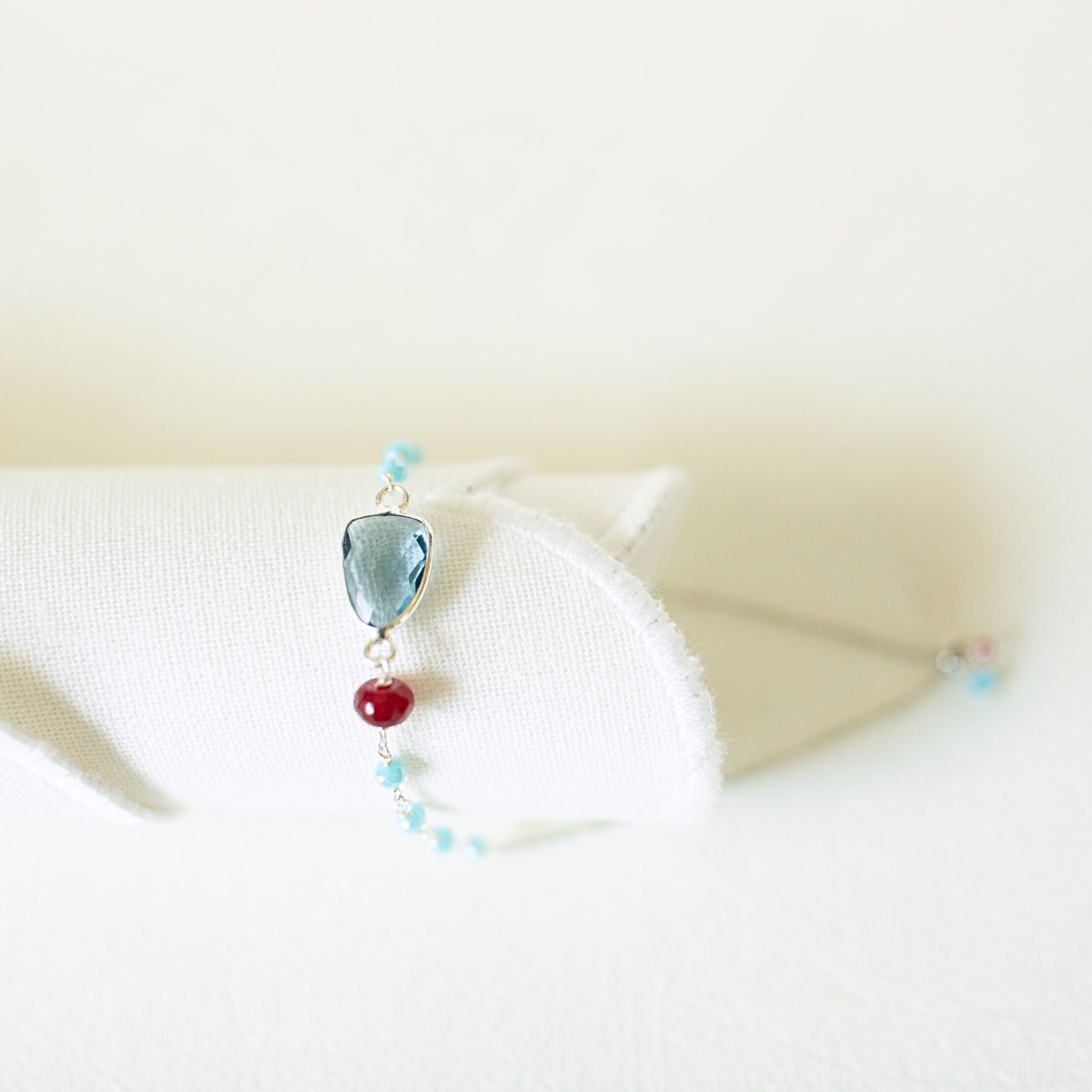 A deep ocean blue, this London Blue Quartz stone is just the right amount of arm drama. Handmade with a sliding clasp to fit any wrist. Available in tarnish resistant 14k gold plated (vermeil) or rhodium plated silver.