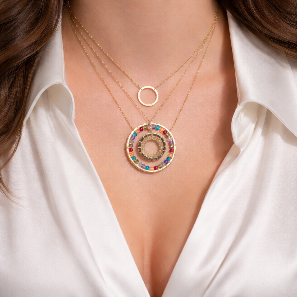 Designed to symbolize the intricate, univeral forces that connect us all, this beautiful necklace features colorful gemstones woven into a unique, lightweight pendant making it the perfect accessory to embrace your inner energy.